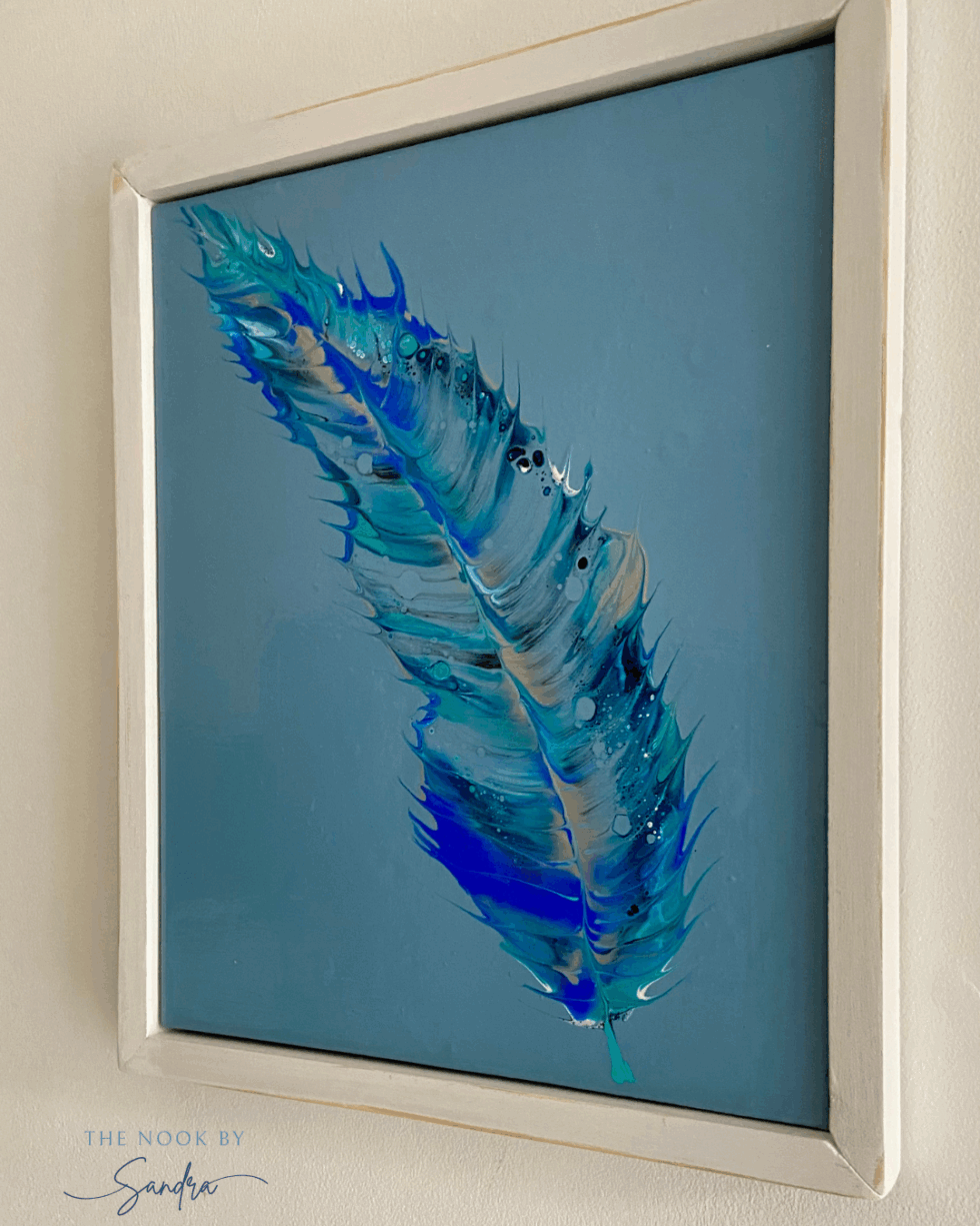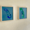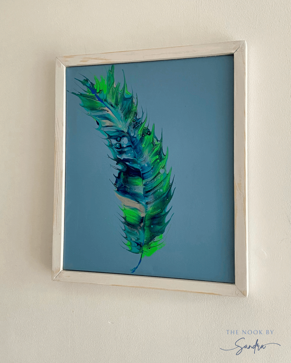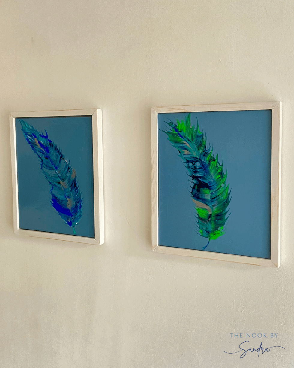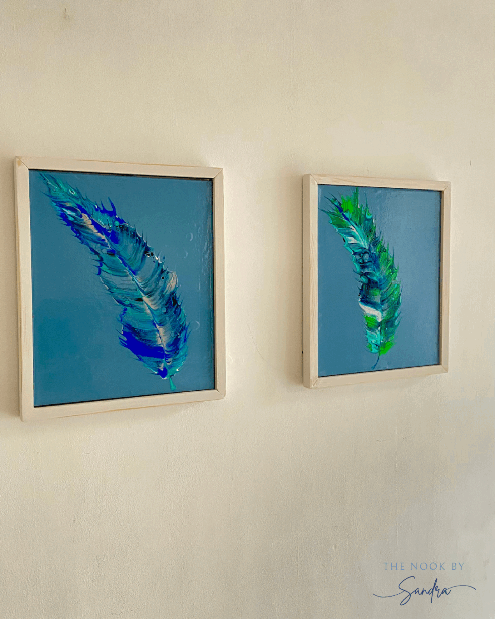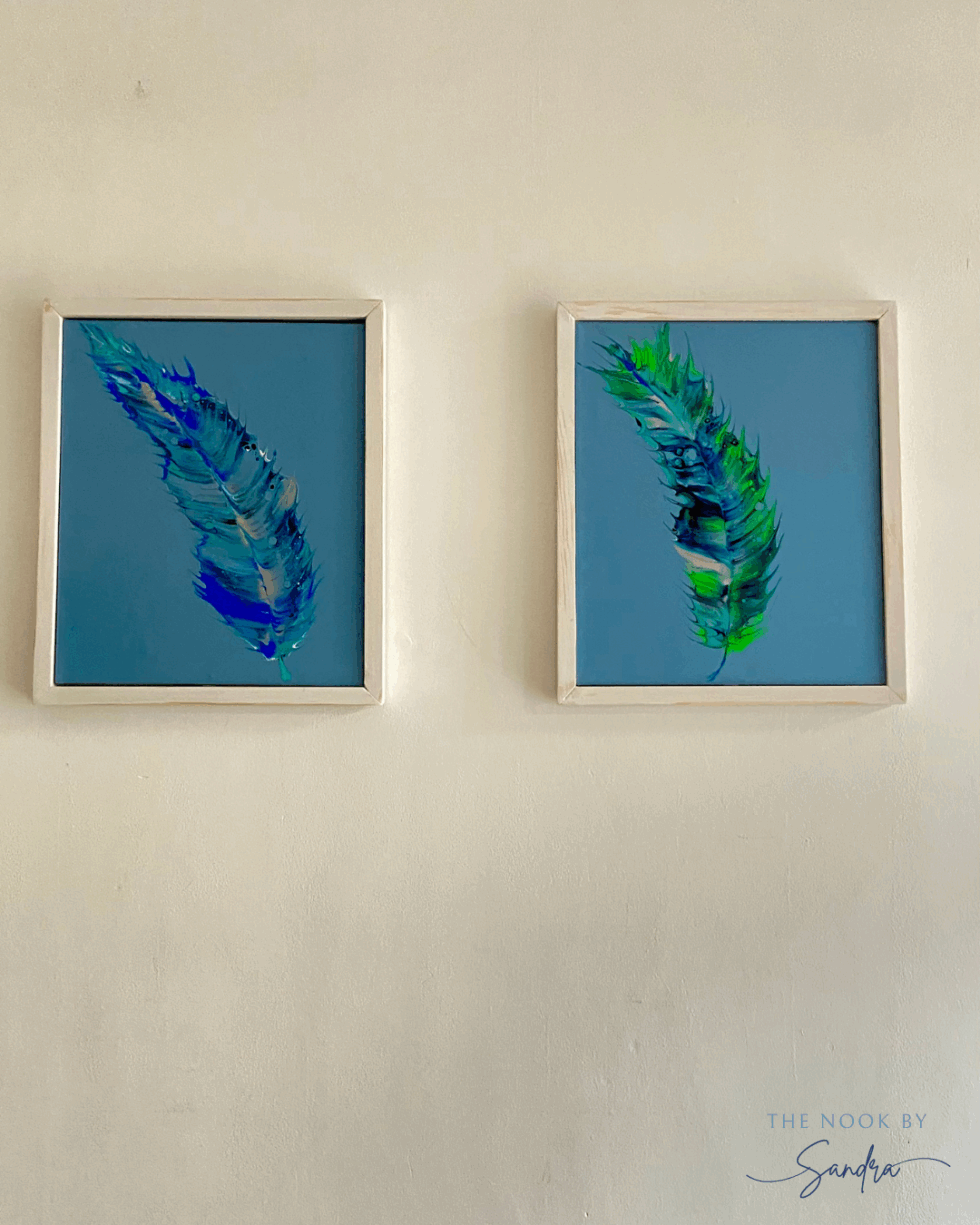 Two feather artworks, each framed in a natural wooden handmade frame, painted in white and slightly distressed. One painted in deep ocean blues, the other blending blues with vibrant greens. Set against soft blue backgrounds, they bring a calm yet lively touch — like a breeze captured on canvas.