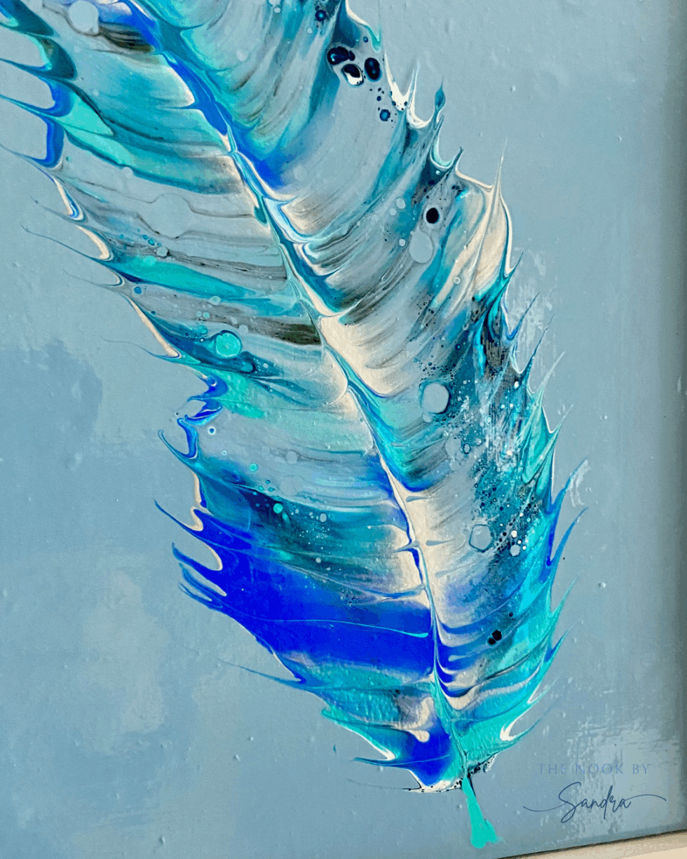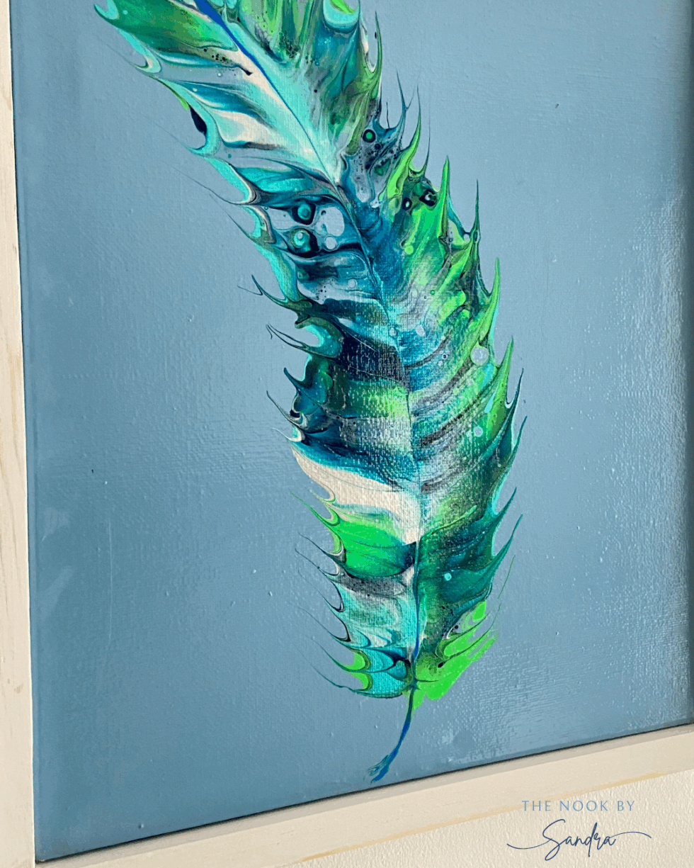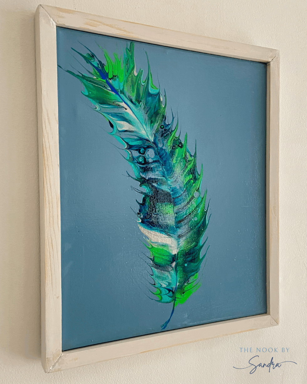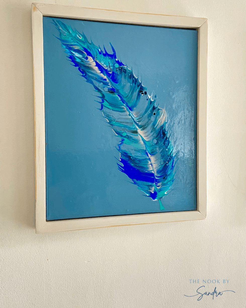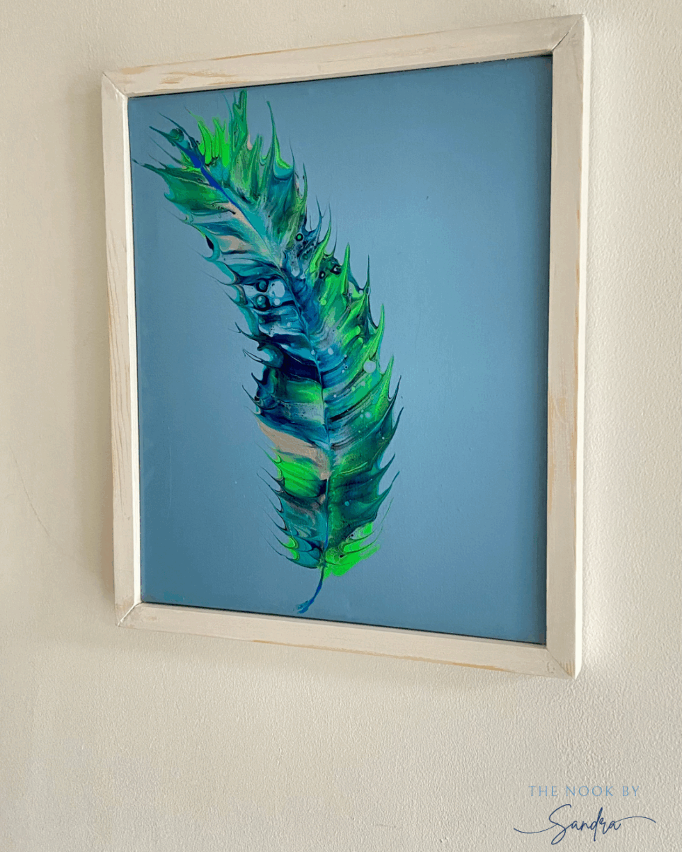 Two feather artworks, each framed in a natural wooden handmade frame, painted in white and slightly distressed. One painted in deep ocean blues, the other blending blues with vibrant greens. Set against soft blue backgrounds, they bring a calm yet lively touch — like a breeze captured on canvas.