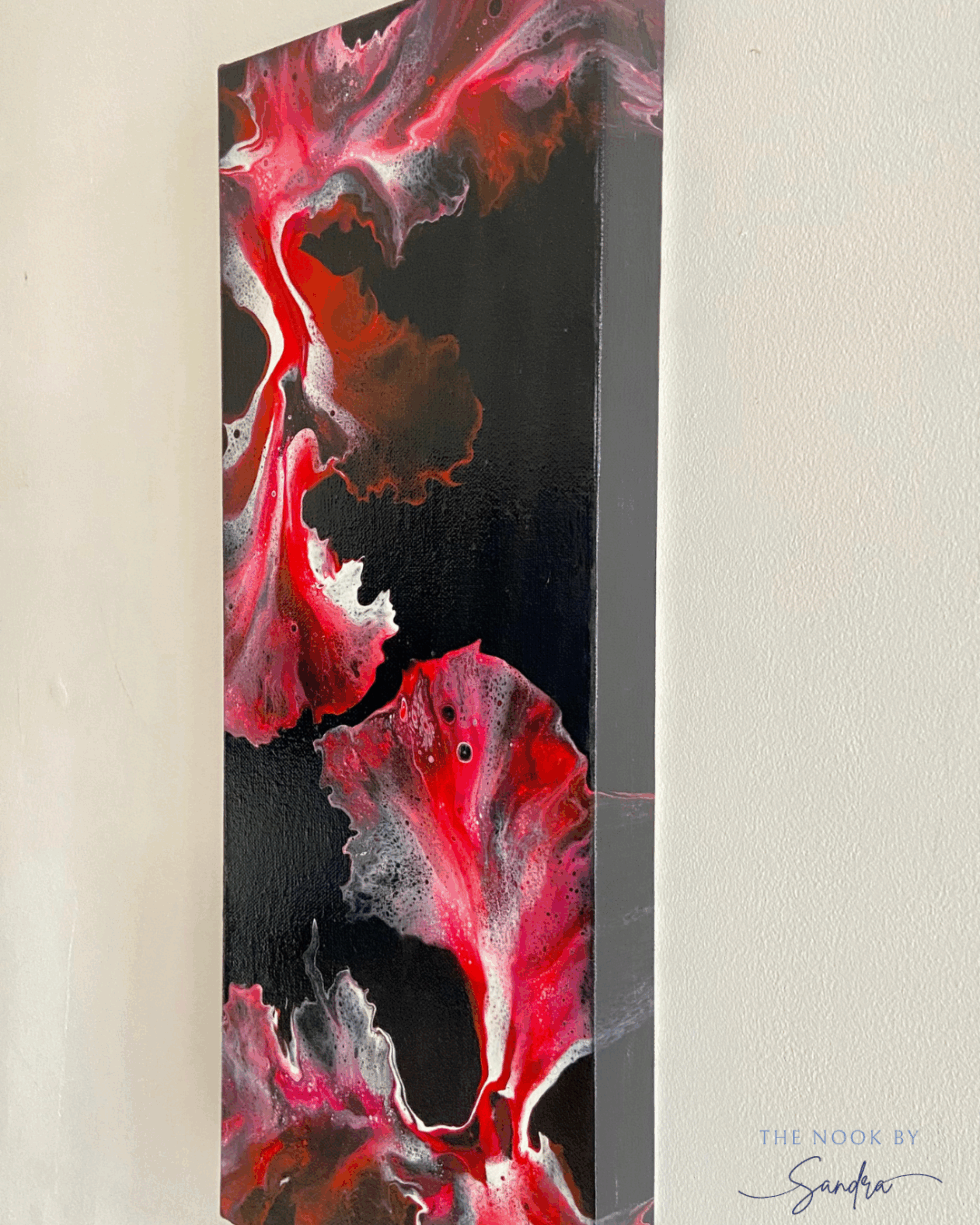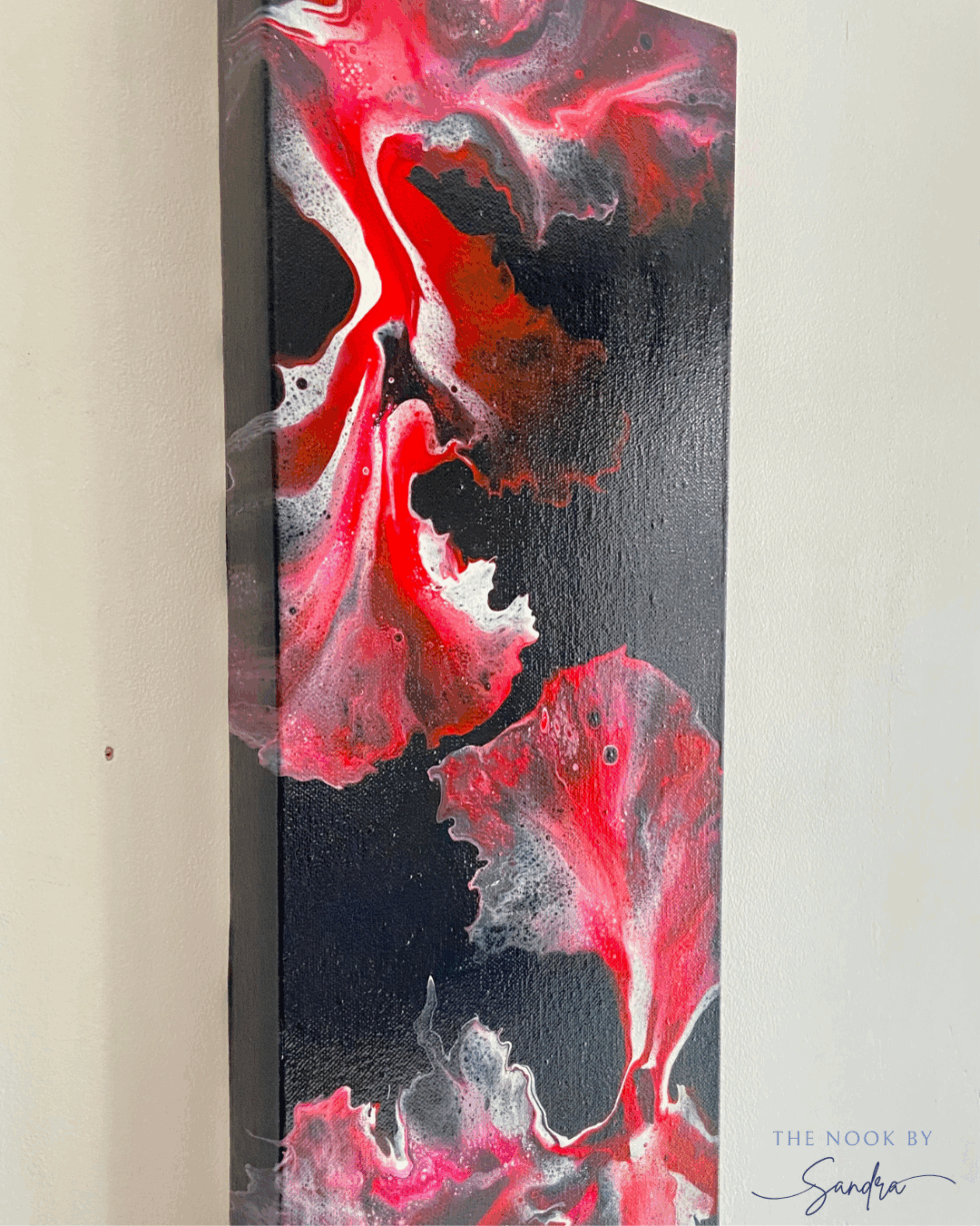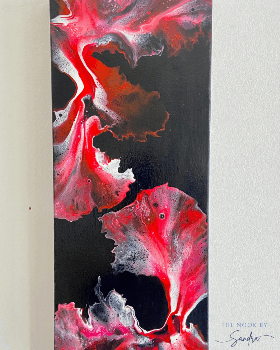 The composition features bold blooms of red, pink, and white with hints of burnt orange and gray, creating an energetic sense of movement. The colors flow outward in organic, petal-like shapes that resemble abstract flowers or bursts of energy. Wisps of white paint soften the edges, adding depth and a smoky finish.